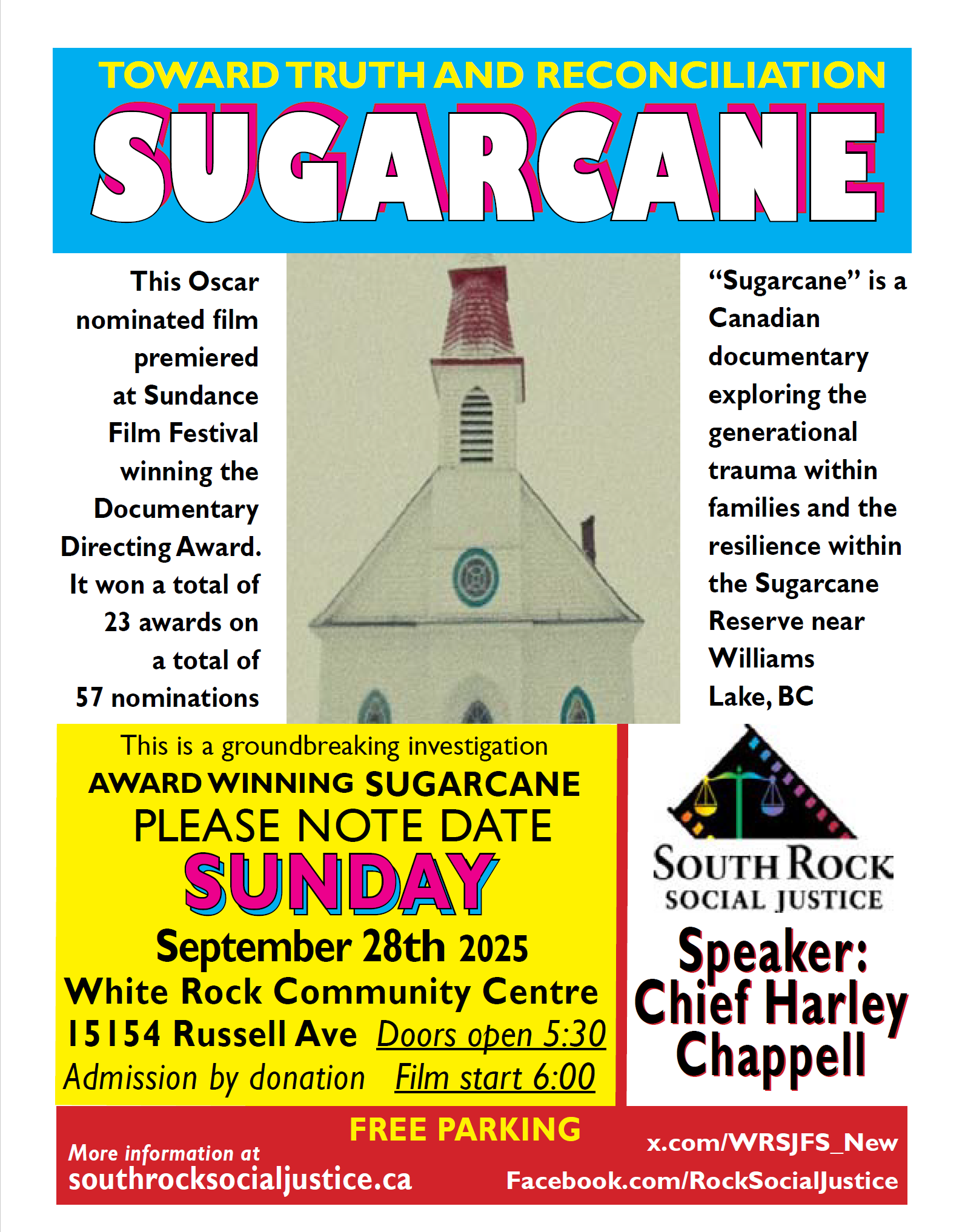 South Rock Social Justice film society is back for the fall, and we’re starting with a story that matters. Sugarcane, a powerful and award-winning documentary that honours Truth and Reconciliation and sheds light on Canada’s residential school legacy. We invite you to join us this Sunday, September 28, 2025 at the WHITE ROCK COMMUNITY CENTRE as we come together through film.